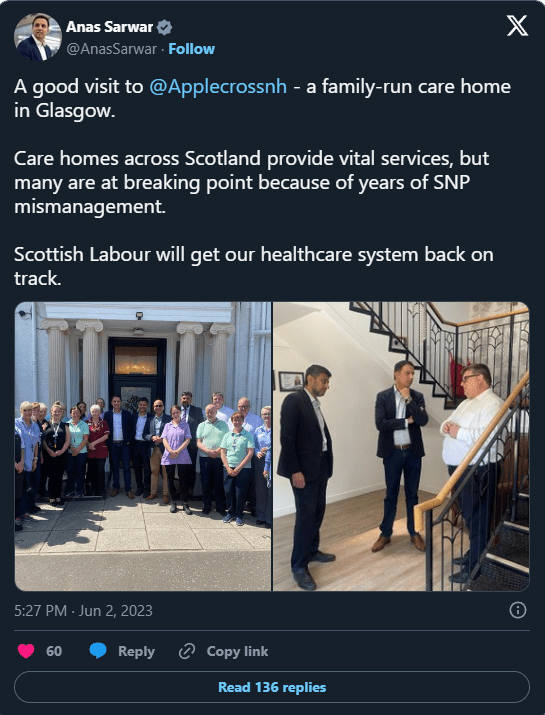 So the care home visited by Anas Sarwar MSP is being used to justify his claim of care homes at ‘breaking point’? If so, this company’s situation must have changed radically since 22 December 2022.