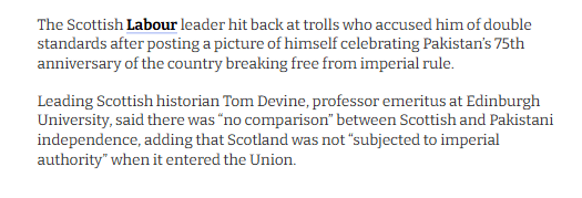 Sarwar’s support for Pakistan’s independence, considered hypocritical by many including me, was dismissed by Devine as ‘no comparison‘ because Scotland was not ‘subjected to imperial authority‘ and because ‘Scots‘ (sic) took part in the Empire with ‘relish and enthusiastic commitment.‘