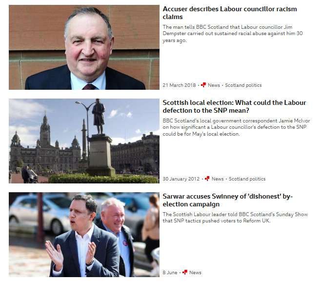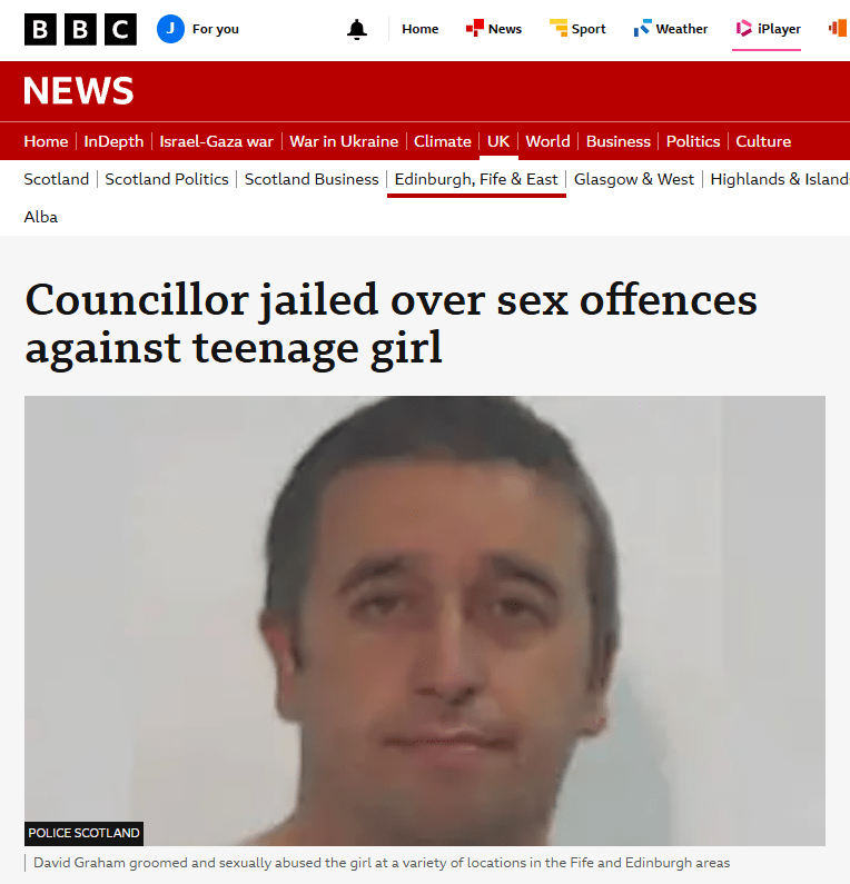 Above, a typical BBC Scotland headline for a Labour councillor who has abused young girls.