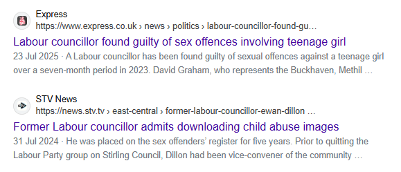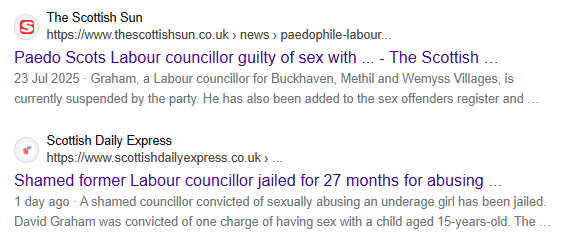 If you try Labour councillor, you’ll get plenty but they’re all in England or Wales. If you try BBC Scotland Labour councillor, you will get only this, with none of the many sex offenders: