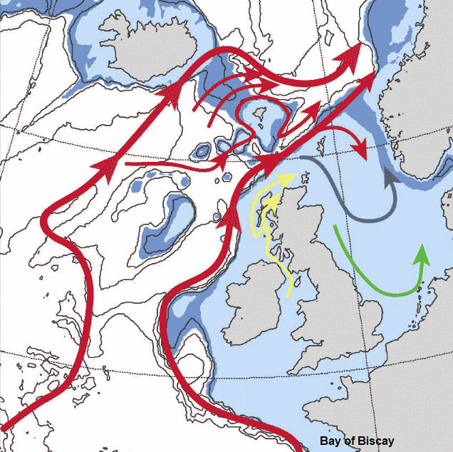 The information provided is based on general oceanographic knowledge about North Atlantic circulation patterns, particularly the North Atlantic Current and its interactions with regional waters like those in the Bay of Biscay and around Scotland. Below are some sources and references that support this understanding:
