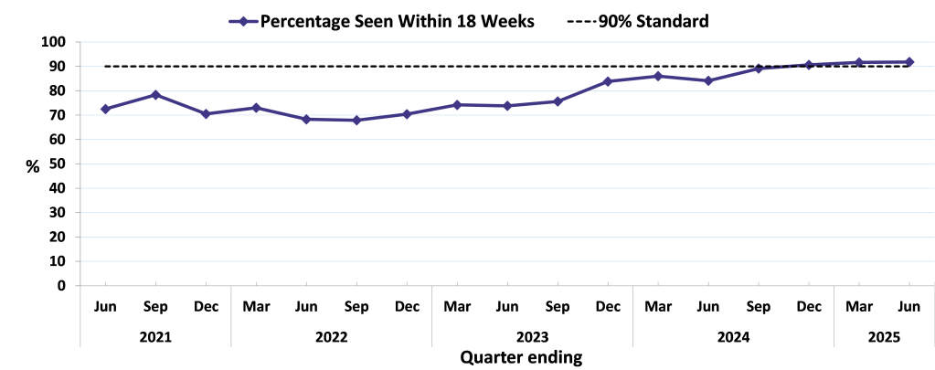91.8% of people started treatment within 18 weeks of referral, which is an increase from 91.6% for the previous quarter and from 84.1% for the same quarter ending June 2024. The Scottish Government standard states that 90% of children and young people should start treatment within 18 weeks of referral to CAMHS.