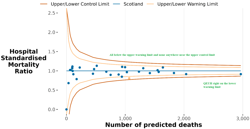 From Hospital Standardised Mortality Ratios April 2024 to March 2025 published today, the above graph reveals that all of Scotland’s hospitals have mortality ratios within the normal range confirming the complete absence of any postcode lottery here.