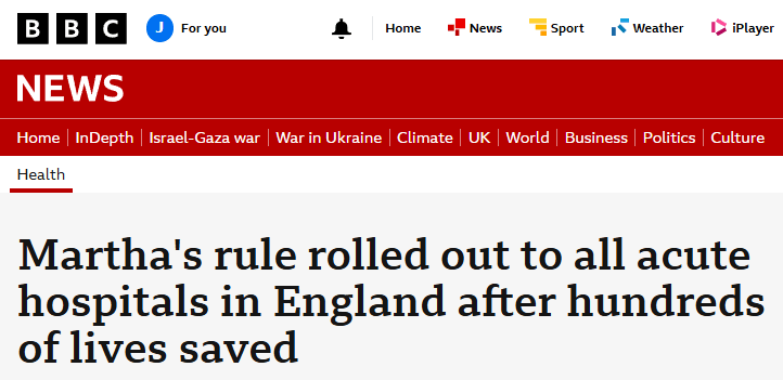 In 2022 a coroner ruled, external Martha would probably have survived if she had been transferred earlier to intensive care and given appropriate treatment The Scottish Government is testing a number of Martha’s rule pilots and considering developing a “more consistent, nationwide approach”. https://www.bbc.co.uk/news/articles/c8e1zw28766o