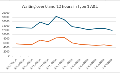 In NHS Scotland, we can see that the numbers waiting more than 8 and 12 hours have been improving. Seasonal variations such as the winter peaks are simply to be expected. What is clear is that fewer are waiting more than 8 and 12 hours in the summer of 2025 than in the summer of 2024.