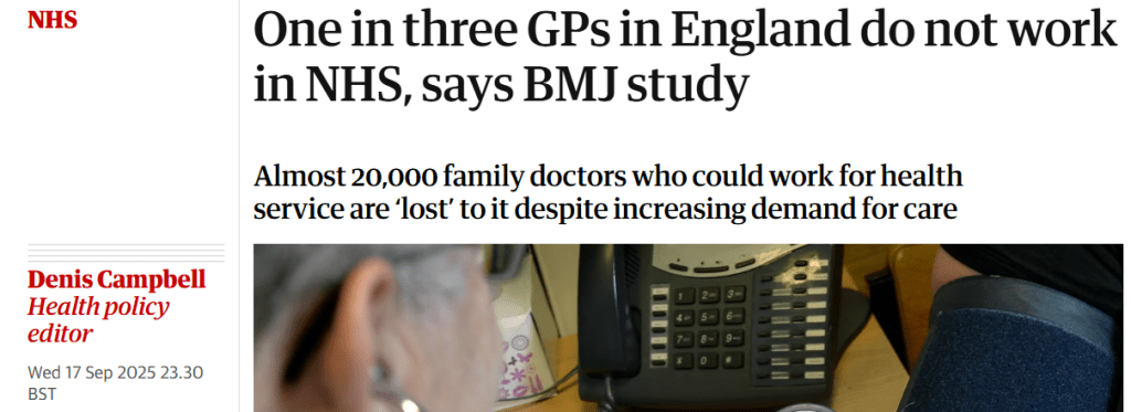 That means almost 20,000 GPs who could be working in the health service are “lost” to it and are not doing so, despite unprecedented demand for care and many government initiatives to try to increase GP numbers.