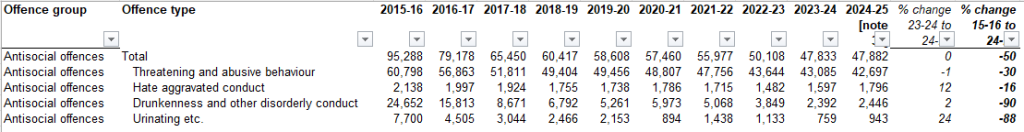 From Recorded Crime in Scotland, 2024-25 published in June 2025, we see massive reductions in all forms of anti-social behaviour, an overall halving and major reductions in every type.