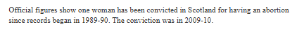 There has not been an abortion conviction in Scotland since the Abortion Act 1967 came into force on April 27, 1968. Under the Act, which applies to Scotland, abortions are legal up to 24 weeks (or later in cases of severe fetal abnormality or risk to the woman’s life) when approved by two doctors. Procedures outside these grounds remain a criminal offense under common law, but no prosecutions or convictions have occurred since the Act’s implementation.This reflects Scotland’s pre-1967 common law, which was more flexible for therapeutic abortions than England’s Offences Against the Person Act 1861, leading to fewer prosecutions even before 1967. Historical records and legal analyses confirm the absence of cases, with experts noting that the Act’s framework has effectively prevented criminal actions against compliant procedures. Recent discussions on decriminalization highlight this record as a reason for reform, though the law still carries criminal potential. Yes, there was one recorded conviction for an illegal abortion in Scotland during the 2009–2010 financial year (which spans 2009 and early 2010), according to official figures from the Scottish Parliament’s Information Centre. This marks the only such conviction in Scotland since detailed records began in 1989–1990, and it appears to be an isolated case under common law for procuring an abortion without medical sanction, rather than a procedure compliant with the Abortion Act 1967. No further details on the case (such as the individual’s identity or exact circumstances) are publicly specified in available summaries, and prosecutions remain exceptionally rare overall. This outlier does not alter the broader historical pattern of non-enforcement in Scotland compared to England and Wales.