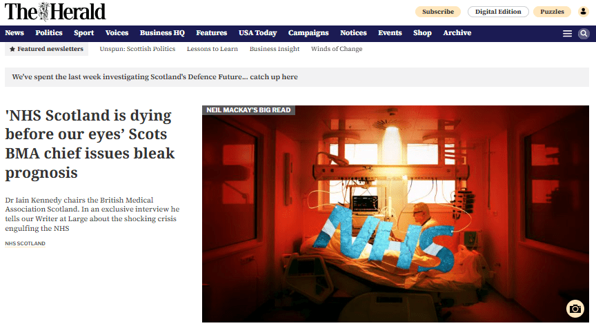 Notwithstanding the above evidence, there is a key difference in how the BMA’s communications via the mainstream media operates in Scotland compared to other parts of the UK. (The status of the NHS in NI and Wales would on the same set of metrics be at least if not much more ‘problematic’!)