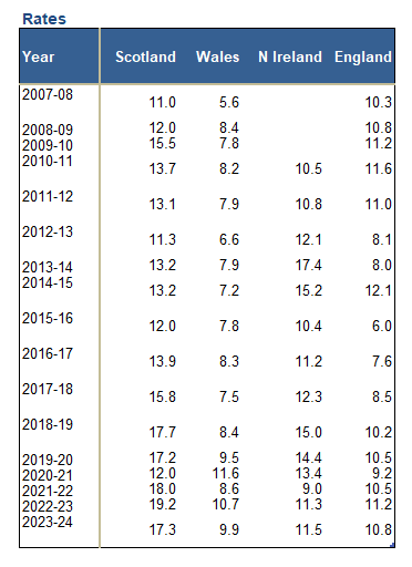 From Housing Statistics for Scotland Quarterly Update: New Housebuilding and Affordable Housing Supply to end June 2025 published today – Affordable [and social] housing delivery across the UK as a rate per 10,000 population 2007-08 to 2023-24 (years to end March): https://www.gov.scot/publications/quarterly-housing-statistics-september-2025/