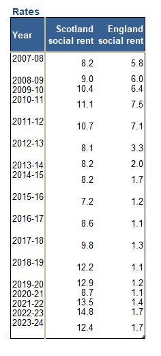 Social rent is typically set at 50-60% of market rent while affordable rent can be as high as 80% of market rent, so the former is critical in tackling poverty. Over the last 18 years, the SNP Government has boosted social rent by around 30% over the previous Labour Government in Scotland and to more than 6 times greater than in England.
