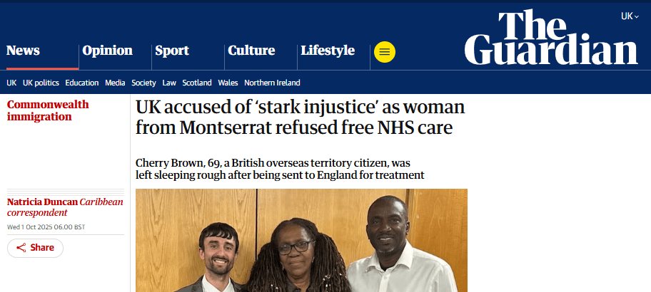 The UK [sic] has been accused of a “stark injustice” for failing to provide health services and humanitarian support to citizens of British overseas territories after a woman from the Caribbean island of Montserrat was refused free NHS care and left homeless.