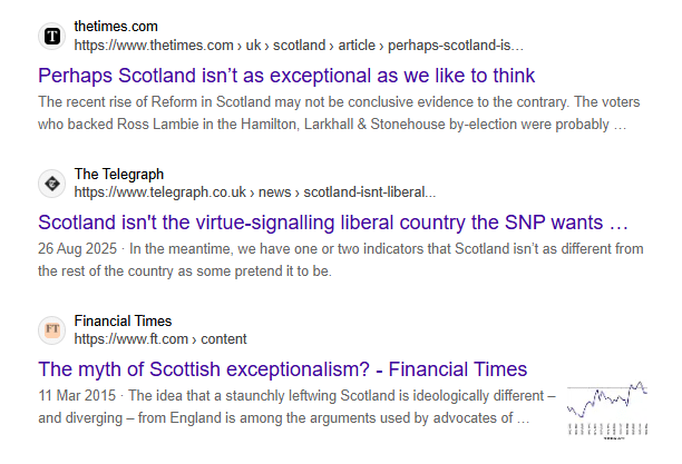 July 2025 – “Myth of Scottish exceptionalism is why mediocrity reigns” – “The dull truth is that Scotland is largely an average place in which mediocrity is treated as either monumental triumph or crippling calamity”.