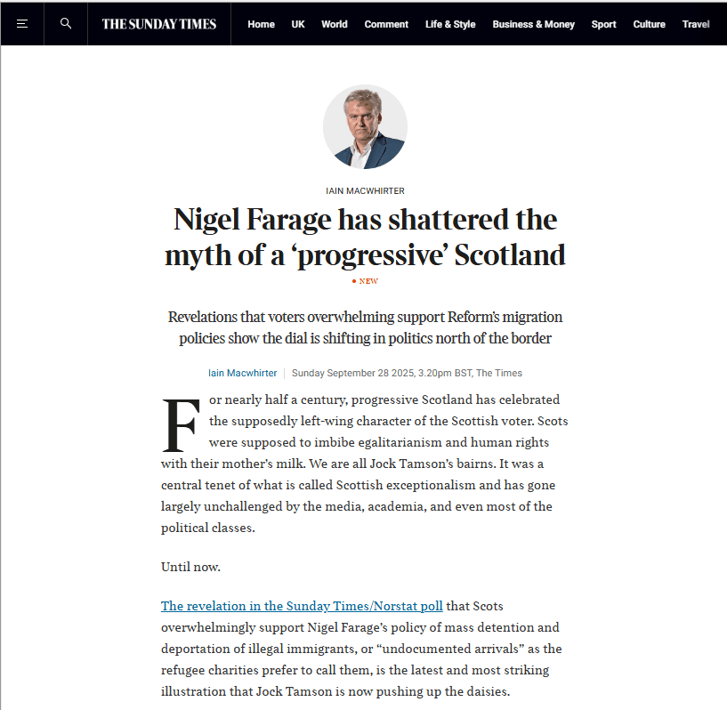 He bases his latest on the Sunday Times/Norstat poll on 22-25 September 2025, revealing that 60% of the sample (1 010) support mass detention sand deportation of those who arrive in the UK, without permission, for example on small boats?