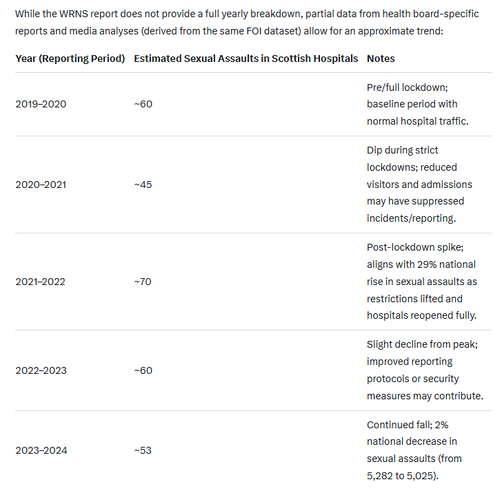 The Sun today has the above, based on research by the Women’s Rights Network – HOW SAFE ARE OUR SCOTTISH HOSPITALS? THE CONCERNING EXTENT OF SEXUAL ASSAULTS AND RAPES IN SCOTTISH HOSPITALS 2019-2024 which carefully does not reveal what the trend is.