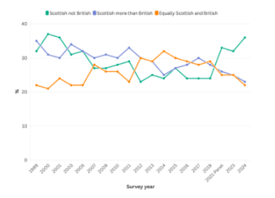 The researchers offer no explanation for this recent collapse, from 2021 to 2024, in the proportion of Scots who consider themselves ‘British’, at all or best as.