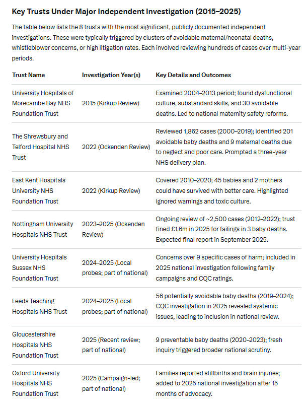 There is currently a ‘national’ investigation chaired by Baroness Amos into 14 trusts maternity services in NHS England, where in total around 500 neonatal deaths might have been avoided but these are the 8 most concerning for patients and local communities: