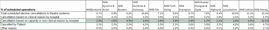 While 7.8% of operations in GG&C were cancelled, only 1.3% were cancelled to to unavailability of staff or operating theatres, compared to 2.2% for NHS Scotland as a whole.