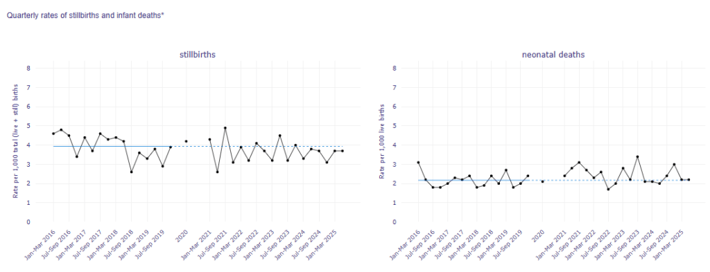 From Scottish pregnancy, births and neonatal data dashboard, published on 14th January 2025, you can see Scotland’s falling stillbirth trend with variation between 3 and 5 per 1 000 births around the ‘normal’ level of 4, from one quarter to the next. There is one quarterly figure of 5 per 1 000 in July-September 2021 but it is not repeated and is no more significant then the very low figure in the previous quarter. Scotland’s higher level of midwife and home visitor staffing must be credited as a major factor in this trend.