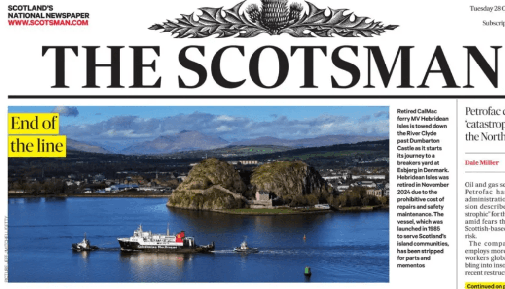 Today, the MV Hebridean Isles, 40 years-old, is off to the breakers yard.