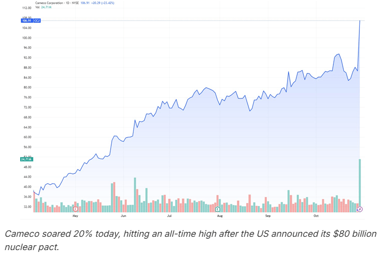 When the U.S. government announced an $80 billion commitment to build new nuclear reactors, Cameco Corp (NYSE:CCJ) became the talk of Wall Street. The stock skyrocketed 20% in a single day, adding $9 billion to its value and reaching an all-time high of $106.91. Analysts gushed. Investors piled in. It was the obvious winner.