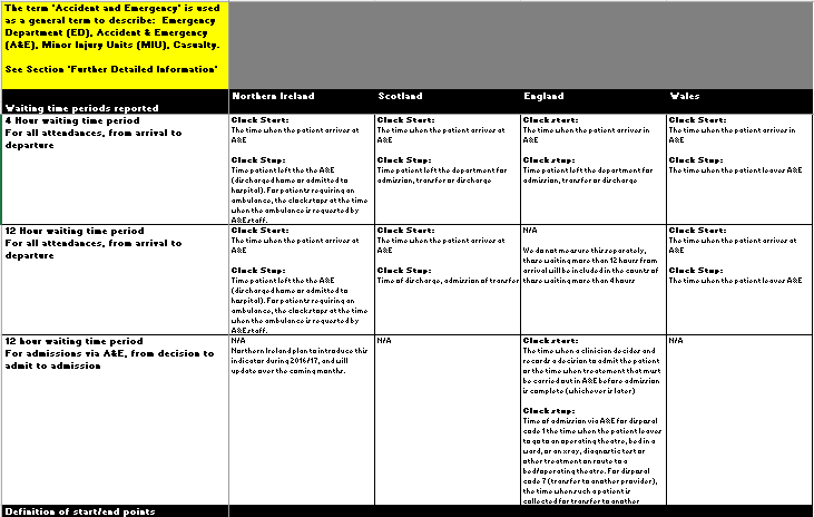 When comparing statistics on long periods spent in A&E in England with those in Scotland, it is always important to check the exact nature of the metric being used.
