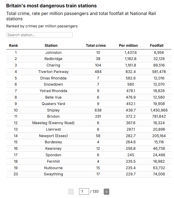 The first Scottish station other than the tiny footfall Newton-on-Ayr, is Dumbarton East at 334 at 49.7 incidents per million. Glasgow Central is at 351 with only 12.4 per million.