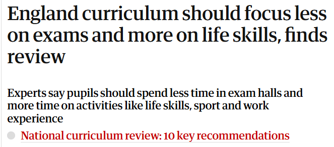 A review of England’s curriculum has recommended reducing the amount of content and emphasis on exams and instead focusing more on life skills and “enrichment”.