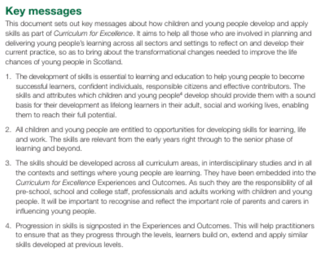 just a few statements from http://www.oecd.org/en/publications/scotland-s-curriculum-for-excellence_bf624417-en.html