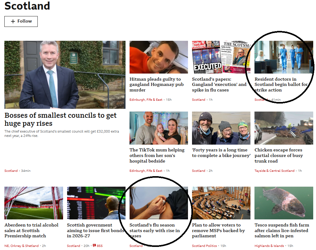 In mid-November, as resident doctors in England actually begin strikes which caused 53 000 excess deaths last time BBC Scotland headline hopefully a ballot for action which may or may not begin ‘next year!’
