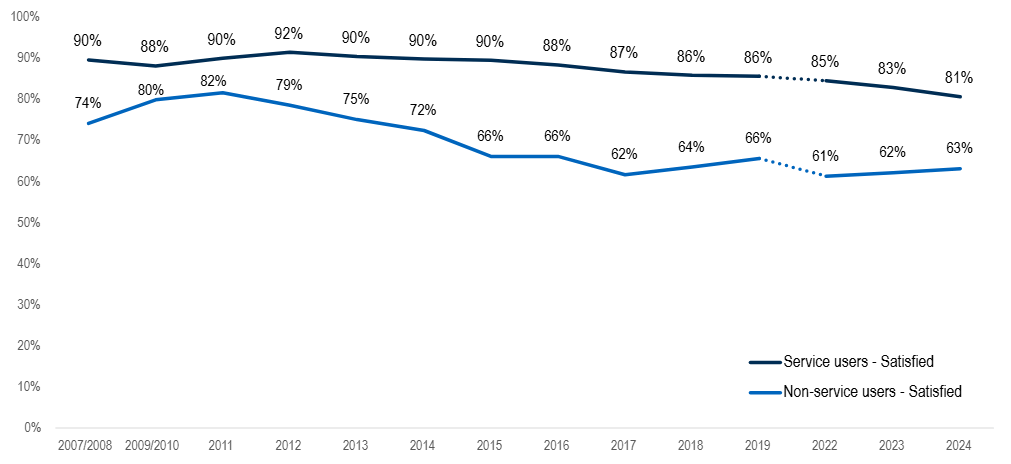 The above graph from Scottish Household Survey: Satisfaction with Schools, 2024, published today, shows a fall in the overall satisfaction satisfaction with Scottish schools by those adults who use them to 81%.