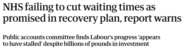 All things being equal, with 10 times the population, the NHS England figure should be around 7.2m but according to the Guardian2 today is 7.4m, 2.7% longer but that means 200 000 patients in England on the waiting list when they would not have had they lived in a country where the health service was run by the SNP and 20 000 living in Scotland who are not waiting because they live in Scotland.