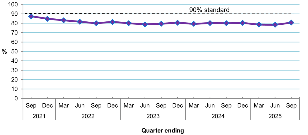 80.7% of people started treatment within 18 weeks of referral, which is an increase from 78.3% in the previous quarter, and an increase from 80.0% for the quarter ending September 2024.
