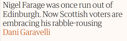 “Nigel Farage was once run out of Edinburgh . Now Scottish voters are embracing his rabble rousing”.