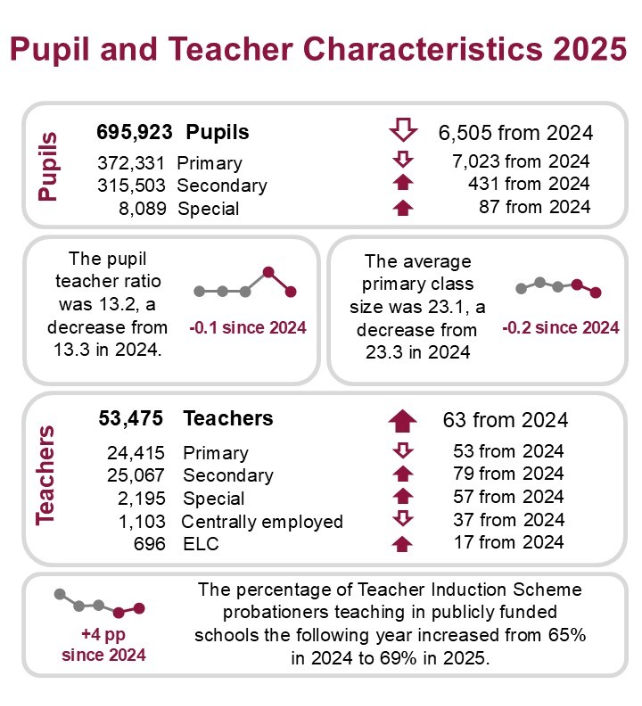 From Pupil and teacher characteristics 2025 published yesterday, the above data revealing a significant fall in pupil numbers yet a small increase in the number of teachers.1