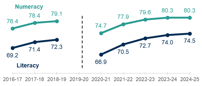 Literacy 68% – 74% in Scotland for P1, P2 and P7 – almost 10% more attaining at this level.