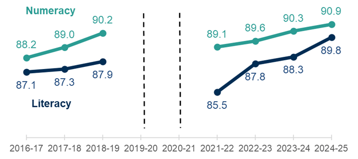 From Achievement of Curriculum for Excellence (CfE) Levels 2024-25 published today, we see that in Scotland’s schools there have been significant increases in the numbers of pupils achieving the expected levels in the four years since the pandemic.1