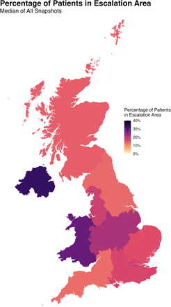 Hospital level surveys with variable methodology from 21 hospitals in Scotland and 15 hospitals in Wales suggest escalation area use is routine and widespread, but the UK-wide picture has not been established. https://emj.bmj.com/content/early/2025/11/29/emermed-2025-215301#DC1