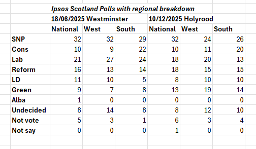 - The YouGov poll 5 November 2025 is the only other with a regional breakdown but does not ask how you would vote but rather who you would never or definitely consider voting for on a 0 to 1 score. 37% and 38% in South and West respectively would consider voting for (6-10) the SNP, at least 10 points clear of all but Reform where it’s a massive 20 points clear.