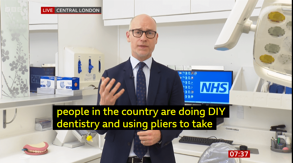 BBC Breakfast had extended and intensive coverage on the dentistry crisis in England, with the above images of queues around the block to even get on a dentist’s waiting list, and a minister admitting that folk are using pliers on themselves, 18 months after his government came to power.