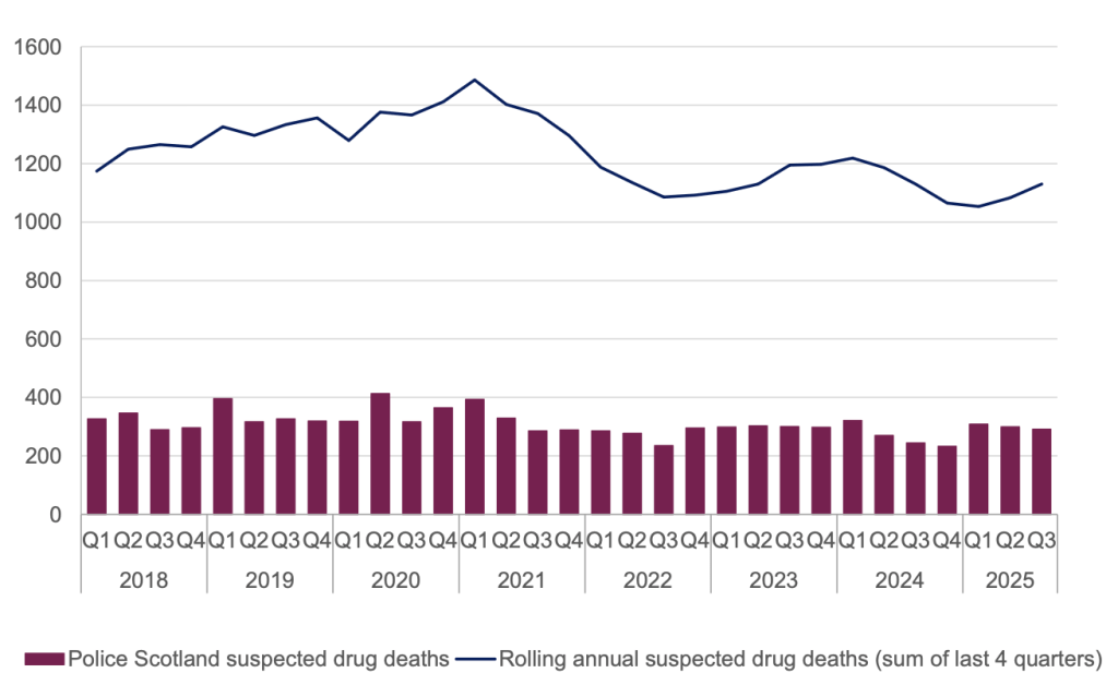 There were 1,130 suspected drug deaths over the 12 months to September 2025, the same number as were recorded over the 12 months to September 2024.