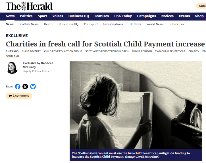 The Herald today with another of their tasteless, exploitative images and demands from charities, the latter lead by folk often more interested in honours from Sir Keir, to demand more from the ‘SNP’ government and, of course, failing to inform their readers of just what that party has already done to radically reduce child poverty, only here, and with the clear commitment, only here, to push for its complete eradication!