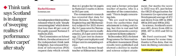 The above is on the front page of the Scotsman, based on a report by the far from ‘independent‘, pompously self-styled Commission on School Reform (neither royal nor government just invented) and fronted by the notorious Carole Ford with, as always, party-affiliation hidden, and at the end evidence of Pisa-data which no respectable published educationist will ever use.