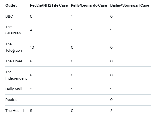 The above table shows the coverage of three trans tribunals in the UK in the last month. The case in Fife in Scotland was covered 55 times in the sample of 8 MSM outlets compared to only 4 times and twice in the other two cases.
