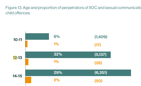 From The National Police Chief’s Council’s National Analysis of Police-Recorded Child Sexual Abuse & Exploitation (CSAE) Crimes Report for 2023, based on data collected from 42 police forces across England and Wales, we see 1 409 perpetrators between 10 and 11, 5 137 perpetrators between 12-13 compared to only 43 in Scotland and 6 351 perpetrators between 14 and 15 compared to only 43 in Scotland.