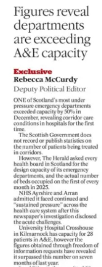 The Herald today is headlining ‘Intolerable’ level of corridor care in Scotland’s hospitals’ with the above explanation of their method. They asked every Scottish health board for the design capacity of its A&E departments and for the actual number of beds occupied on the 1st of every month.