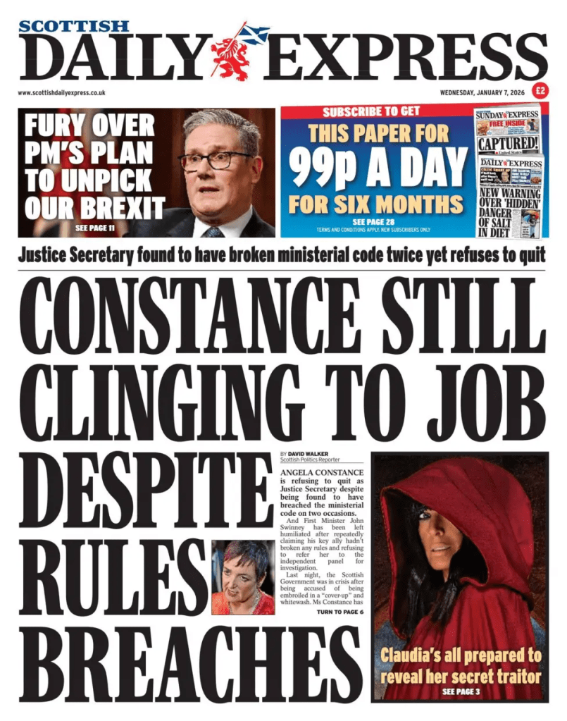 and on the Scotsman frontpage – Constance won’t resign despite code breaches