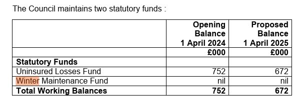 Winter Maintenance Fund – Allocated for unexpected winter and emergency operations. The existing revenue budget is based on a mild winter scenario, meaning additional funding may be required in harsher conditions, however the reserve was drawn down in 2023/24 and not replenished as part of the 2024/25 budget setting, there is no proposal to replenish as part of the 2025/26 budget setting.