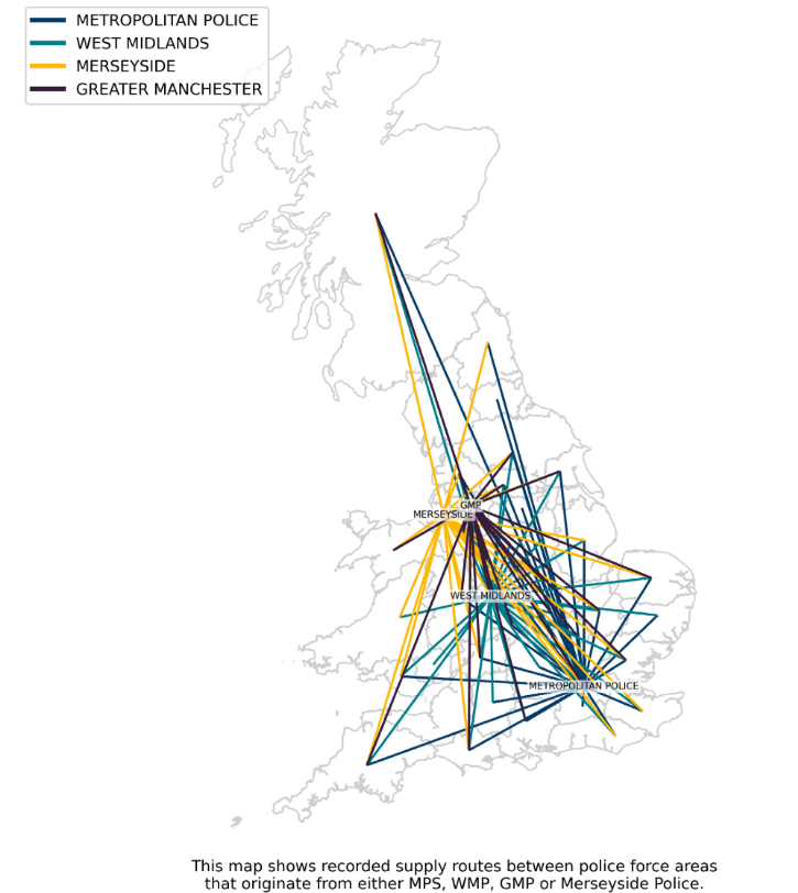 the above graph makes clear the hard evidence that four major police forces in England have the evidence of a significant flow of drugs into Scotland by criminal groups in their areas. Notably, the reported presence of these gangs in 50 locations, from Thurso to Aberdeen and down to East Ayrshire, is not mapped in detail. There are 6 544 County Lines across the UK so around 650 in Scotland.