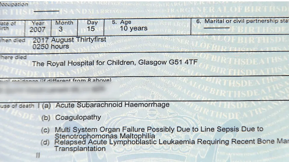 The death certificate in 2019 lists a Stenotrophomonas infection of the Hickman line among the possible causes of death.1